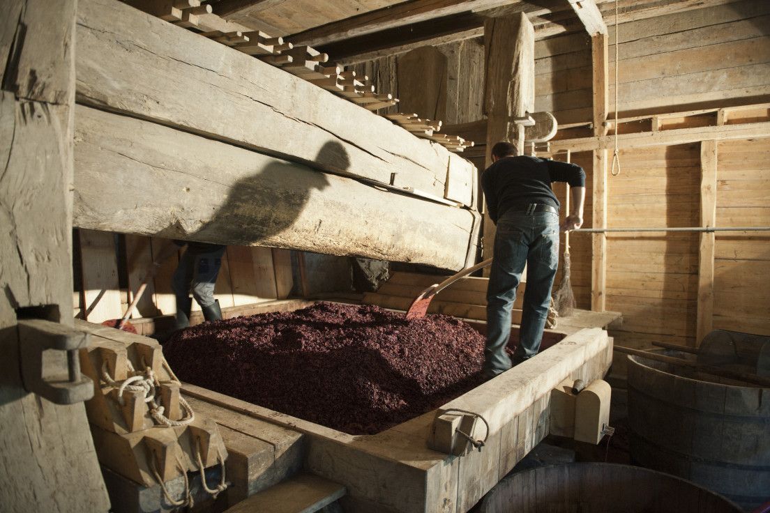 Grösstenteils werden Trauben und Wein mittels Schwerkraft bewegt, um ihnen die mechanischen Strapazen im Innern einer Pumpe zu ersparen. Unseren Pinot Noir No. 3 pressen wir auf der restaurierten mächtigen Baumpresse aus dem 16. Jahrhundert.